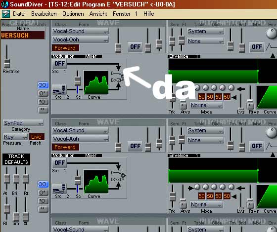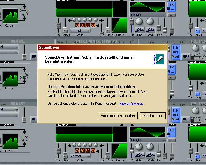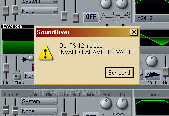 Die Software funktioniert bisher recht schön. Wenn man sich an die DOS-Oberfläche gewöhnt hat, geht das Arbeiten schnell von der Hand. Die Konvertierung ist problemfrei. Konvertiert man einen Song, so werden die Spuren der Pattern in getrennte Spuren umgewandelt. Man erhält also pro Spur des Songs sowie pro Spur des Patterns je eine Spur im MIDI-File. Transponierungen und Stummschaltungen der einzelnen Patternspuren im Song werden korrekt erkannt und umgewandelt. Für Drum-Spuren kann man einen Filter editieren, falls die eigenen Drumsets aus dem TS12 nicht dem GM-Standard entsprechen. Ganze 60-Sequence-Files am Stück zu konvertieren ist nicht vorgesehen. Die Software benötigt keine Installation, das Kopieren in einen eigenen Ordner reicht. Grundsätzlich ein nützliches Programm, wenn auch immer bei solchen Konvertierungen etwas Nacharbeit von Hand anfällt. Die Software läuft unter Windows 9x oder unter Dos. Windows NT, 2000, XP können aus ihrem DOS-Fenster nicht das Ensoniq-Diskettenformat lesen. Der Preis beträgt für beide Programme beträgt $54.95, bei Zusendung per E-Mail kommen da noch mal ein paar Dollars hinzu. Lästig ist, daß man nur per Kreditkarte oder Bankorder-Scheck bezahlen kann. Kontakt:Giebler Enterprises 26 Crestview Drive Phoenixville, PA 19460 USA Voice: 001 (610) 933-0332 Fax: 001 (610) 933-0395 Sounddiver (Emagic)Nun ja, Sounddiver wurde mir verkauft mit der Zusicherung, daß es unter Windows XP liefe. Nachdem ich die Hotline (die sind kompetent und freundlich) mehrmals kontaktierte, erfuhr ich, daß Sounddiver wohl doch noch nicht freigegeben sei für XP. Daher die folgenden Angaben unter Vorbehalt, es scheint hier wohl eher eine unfreiwillige Beta-Version vorzuliegen. Insgesamt gestaltet sich die Bedienung recht langsam, da die Regler auf die Mausbewegung nur sehr langsam reagieren. Ich habe noch nicht alle Parameter kontrolliert (das Arbeiten mit Sounddiver [204 Euro] erfüllt mich mit Kummer, davon vertrage ich pro Tag nur begrenzt viel) Der TS12 (Betriebsystem 2.02) schmiert bei Veränderung folgender Parameter mit Error 129 ab Cutoff Filter 1 Die anderen Algorithmen habe ich bisher nicht auf die Vollständigkeit der Parametersätze überprüft. Dump vom TS12 nach SD funktioniert, umgekehrt auch. Dump Request von SD aus tuts nicht. Da ich (zum Glück) mehrere TS12 besitze konnte ich auch die OS-Version 3.05 ausprobieren; Unterschiede in der Stabilität waren nicht festzustellen. Der TS12 (Betriebsystem 3.1) schmiert bei Veränderung folgender Parameter mit Error 129 ab (Maus und numerische Eingabe) Doppel-Klick auf die Fläche ( s. "da") vom Modulation-Mixer führte jedesmal zuverlässig zum Absturz von Sounddiver: